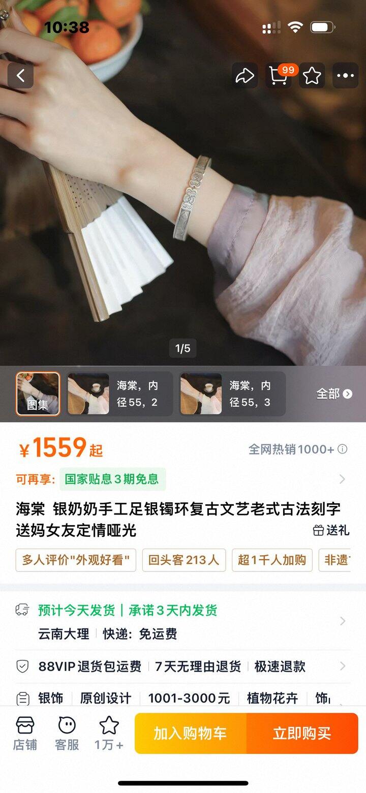 今天点进去一看都这么高了,太吓人了,我250买的25克银手镯都涨到1559了