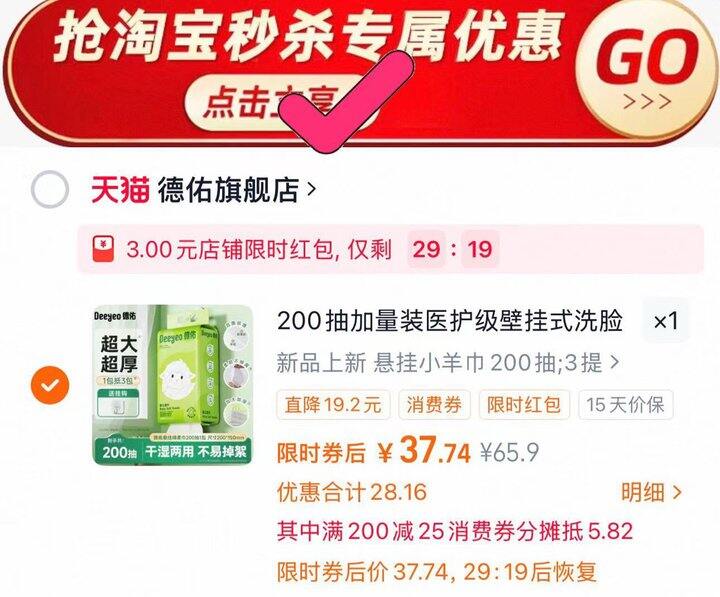 💰12.5/包 德佑小羊悬挂绵柔巾200抽超大包