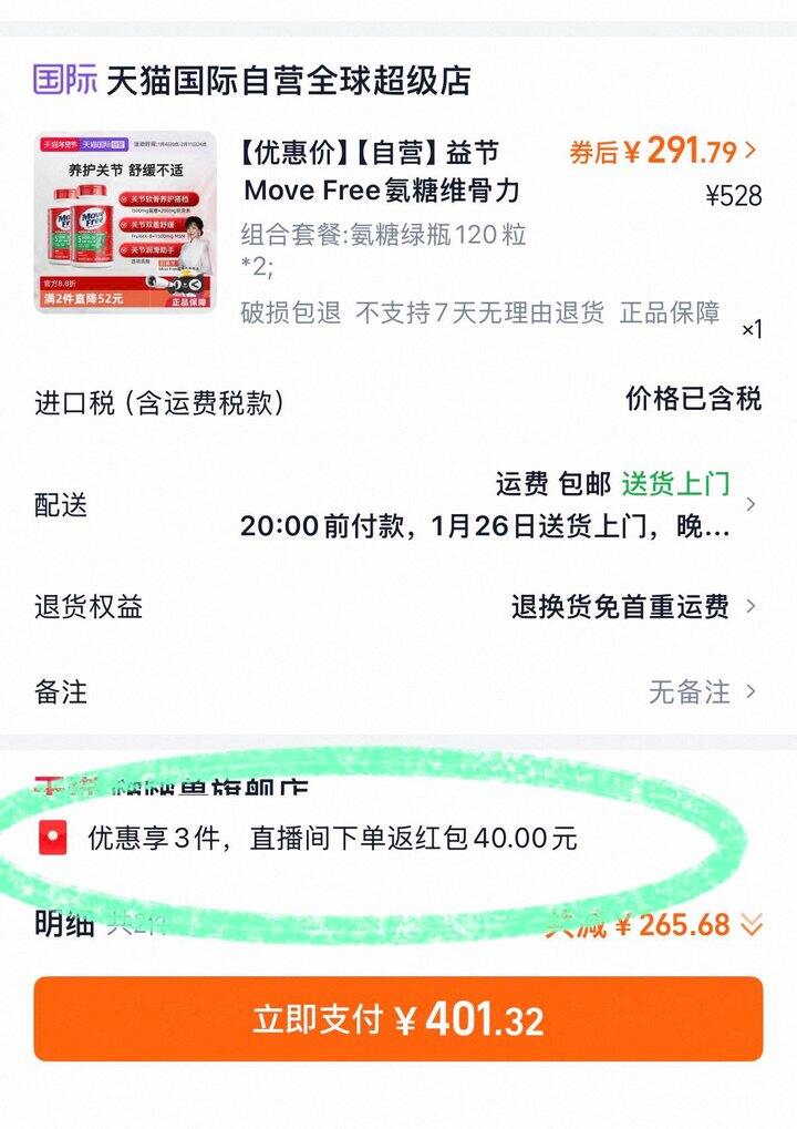 400 粒氨糖 346 返 40 元直播间虹包,氨糖折 0.76/粒