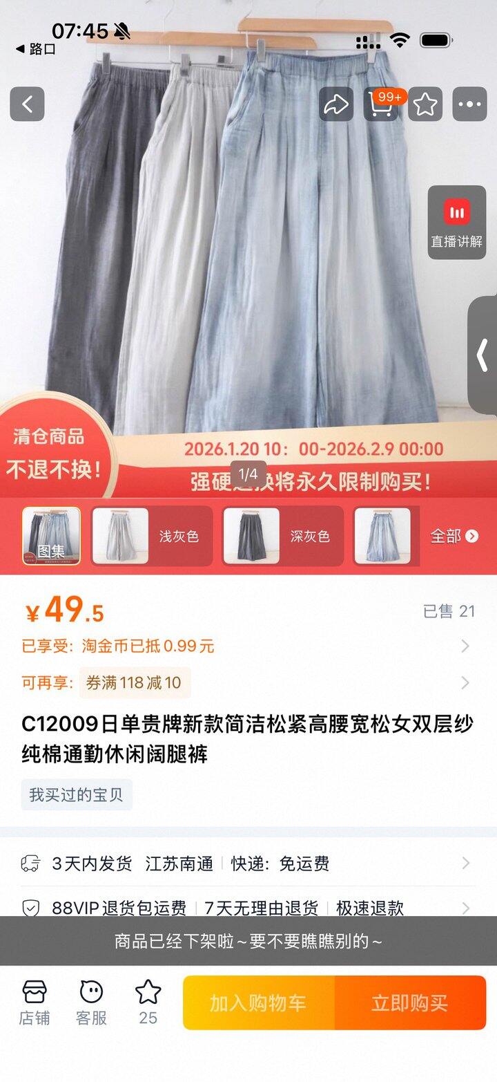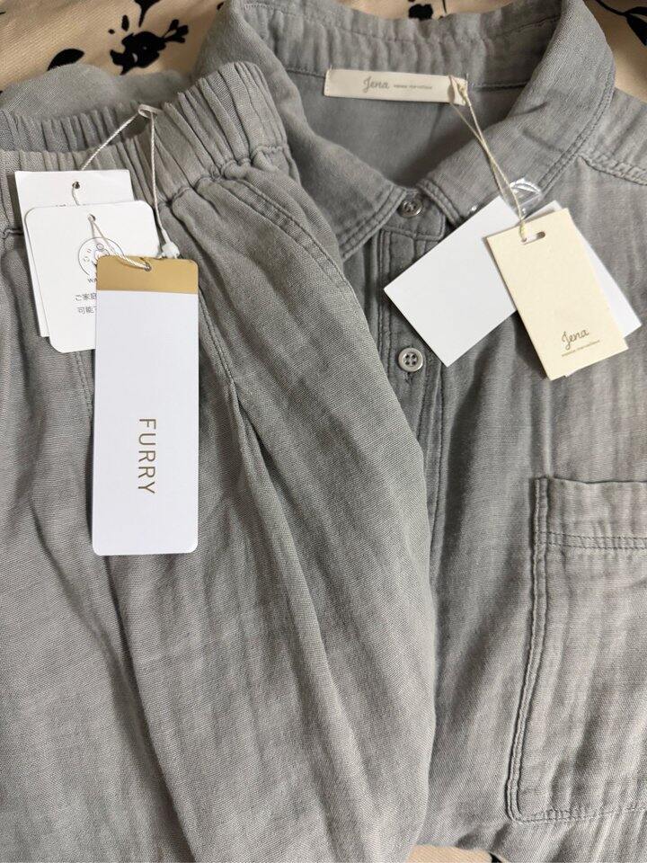 推荐棉纱的套装很值!上衣店铺有货,裤子直播室还能捡,3色都有。我那条裤子捡的有洞[汗],勉强凑了一套!面料非常柔软,夏天舒服的。这个棉纱有2个牌子,Furry、Jena,价格差不多!(棉纱衬衫jena ¥9900日币,furry裤子¥8800)。