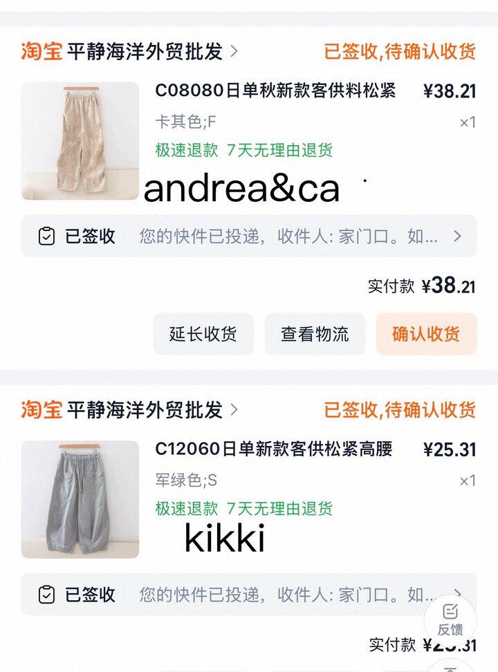 2款裤子已经下架了,kikki的是纯棉电视购物里的贵牌。andrea的也是个贵牌,单层的料子有厚度,冬天可以穿,如果在直播室看到可以入。