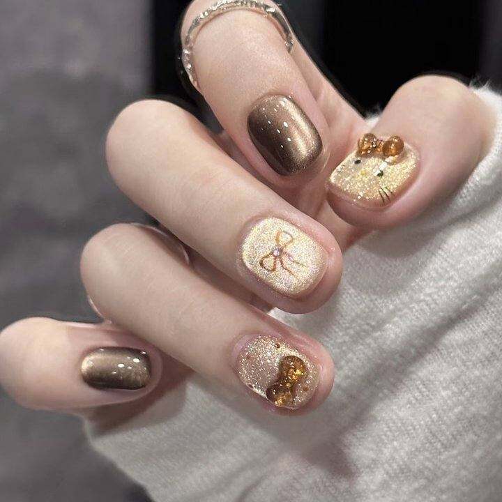 【焦糖Kitty】手工穿戴甲可爱kitty琥珀蝴蝶结波点猫眼显白美甲贴