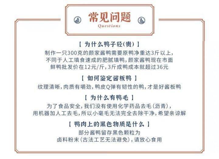 自带调料包,两种口味随心Diy每一只酱板鸭都配备了特制的颜家酱颜家酱是由老卤香料用茶油炒香而成跟颜家另一款经典产品“颜家酱”风味一致。这款颜家酱,因为香,很多私房菜的老板会买回去炒菜用。如果想吃酱板鸭的原香,直接手撕开吃即可。如果想香辣加倍,淋上酱料包,香味更是四溢。