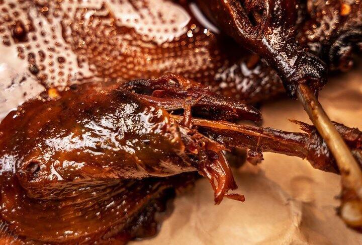 颜家的传统烤制工艺便显得繁琐无比:先用木炭烤干,再卤,再烤,再卤,要反复三次,这样在保留板鸭浓郁香味的同时,又能入味至髓,连骨头都能吃下去。