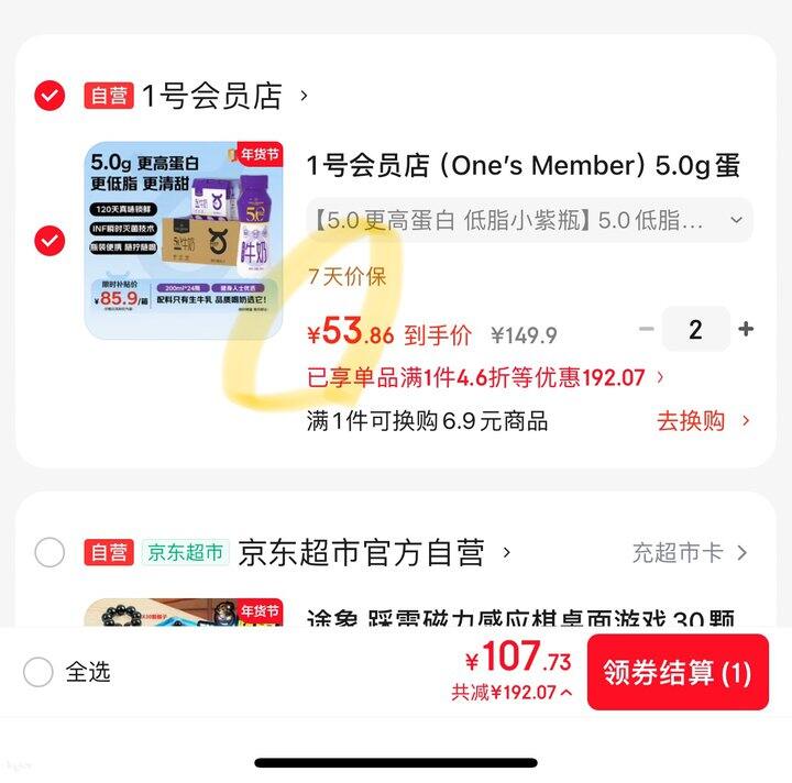 1号会员店5.0g蛋白低脂纯牛奶 200ml*24瓶