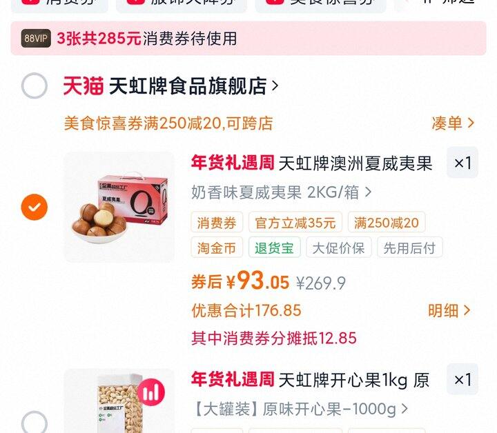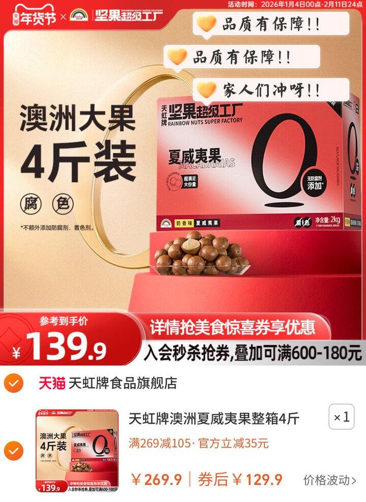 1、天虹牌澳洲夏威夷果整箱4斤 批发营养零食坚果礼盒送礼大礼包https://m.tb.cn/h.7HGBR5Y,淘金币页面加购