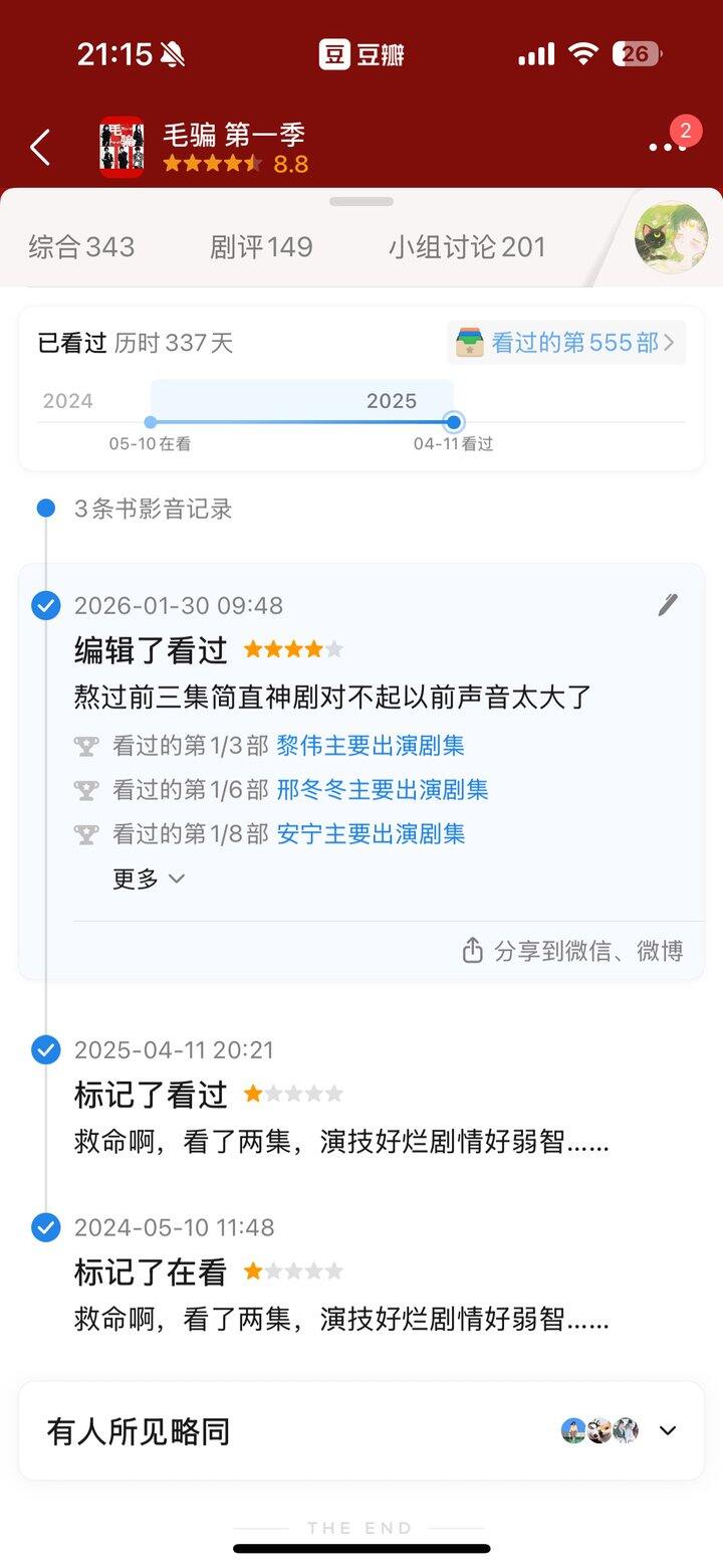 第一季开头看了两次都被劝退,一度以为是什么垃圾电视剧,演技差、拍摄烂、服饰妆造……一切布景都是那么廉价,还从豆瓣打了一星。