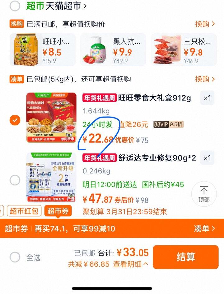 天猫超市首页搜索:坚果(领5元品类金,以超市卡形式抵扣)