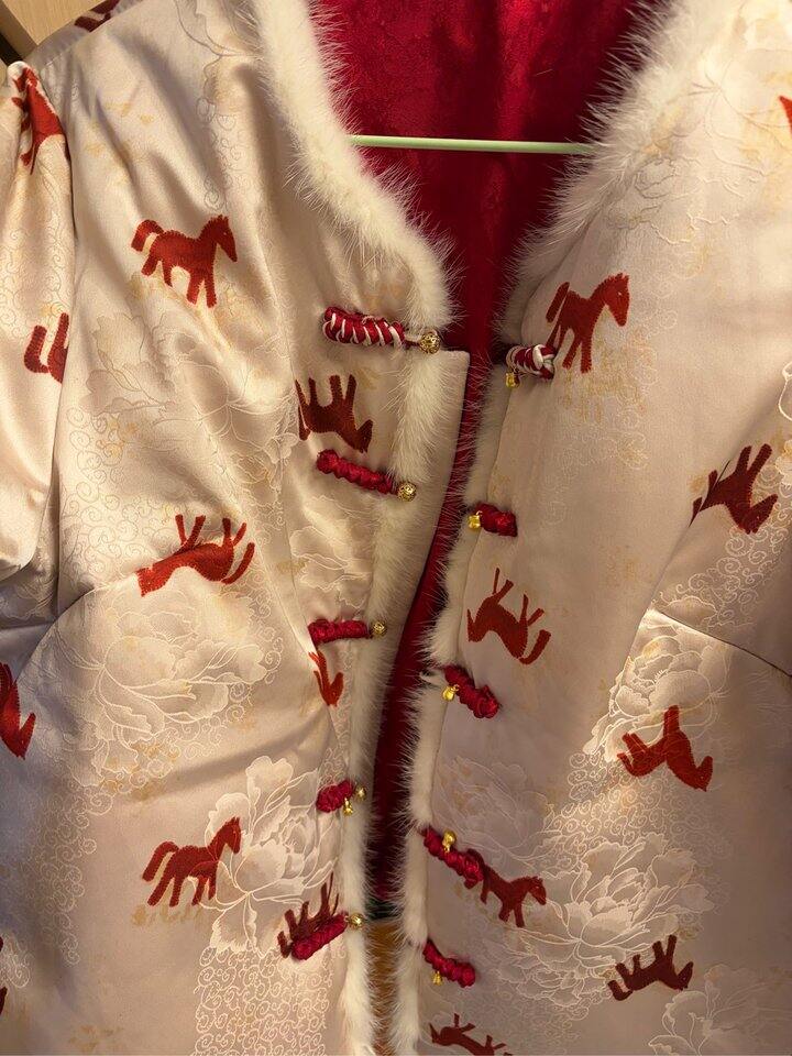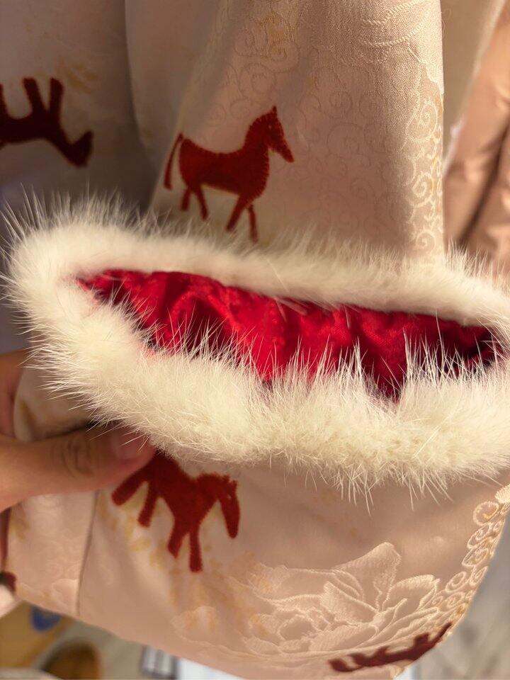 面料含人丝,白鸭绒填充,短款设计,红马图案,国风氛围感满满,细节很精致,做工也不错~
