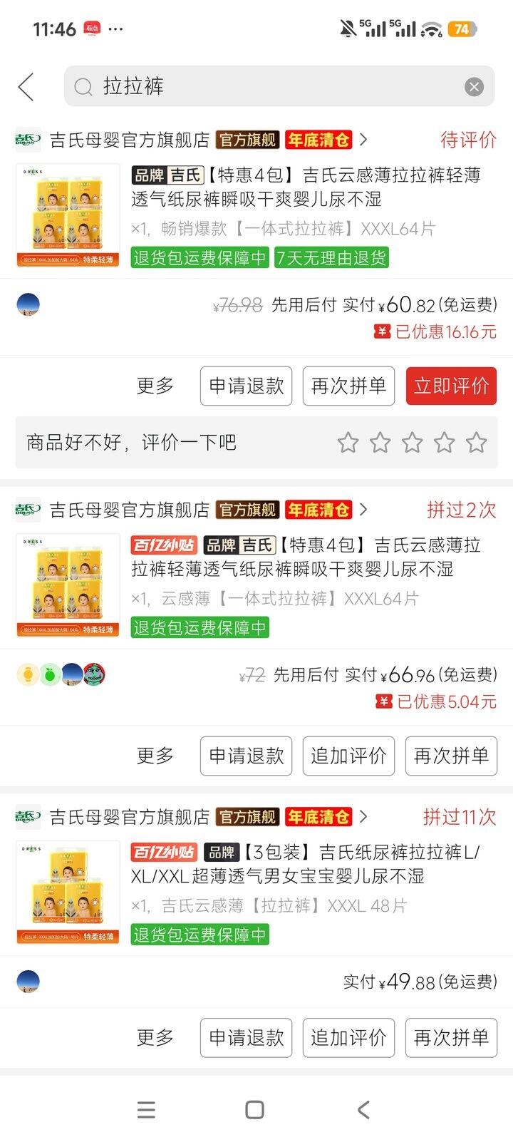 吉氏云感薄拉拉裤,我给孩子买的最大码,活动下来不到1块一条,就算没有活动,也就1块多一点。没买这个之前,我用的巴布豆,但是巴布豆算下来还是贵了,这个柔软度可以,也能兜尿。购买截图没截全,实际买了大几十包了