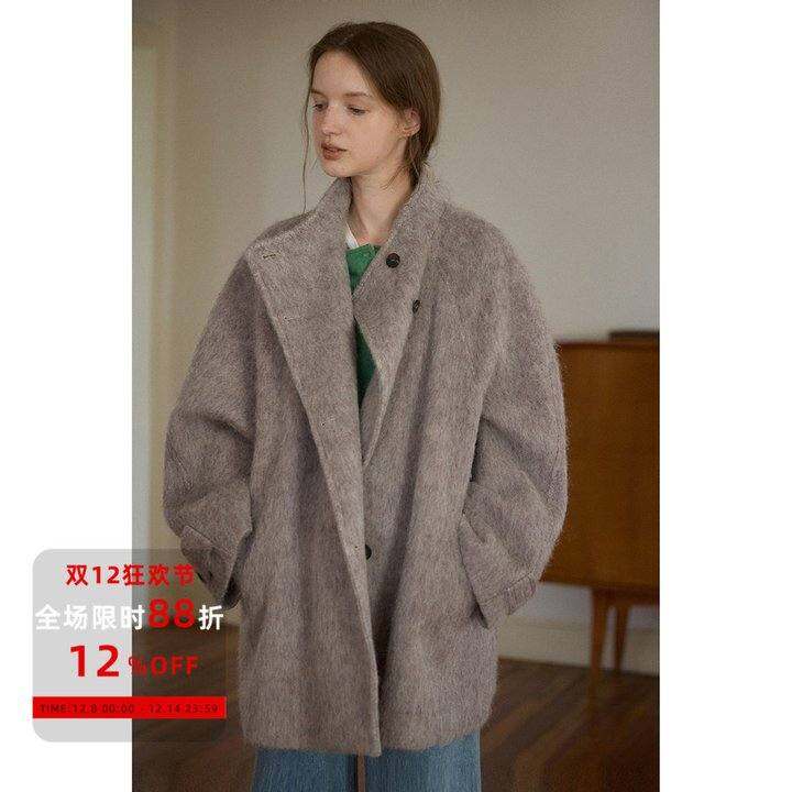 Nice people2025AW绵羊毛混纺水波纹混色肌理感立领插肩袖短大衣