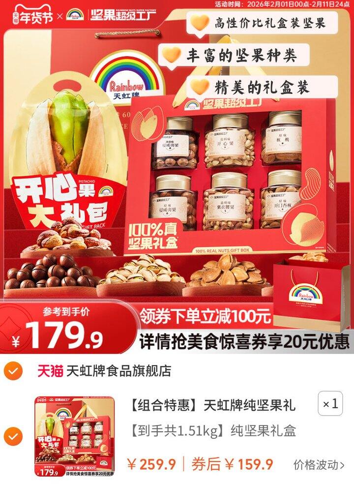 1、【组合特惠】天虹牌纯坚果礼盒开心果组合混合坚果送礼调味大礼包1.5kg: