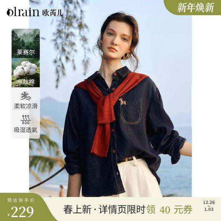 欧芮儿2026春新款莱赛尔牛仔衬衫女法式通勤复古小马刺绣长袖衬衣