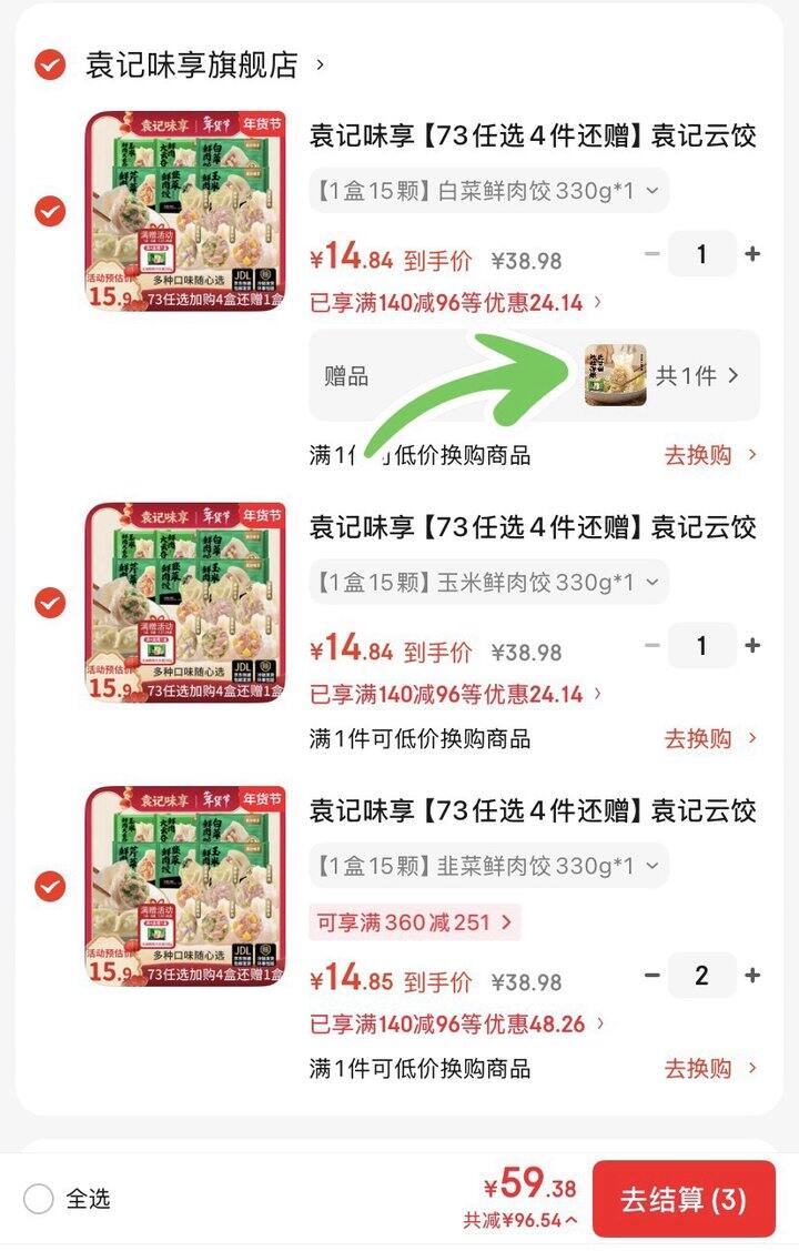 袁记味享鲜肉饺/大云吞 任选4件💰59.9+贈一盒