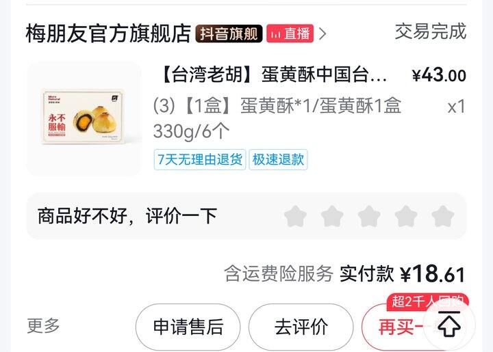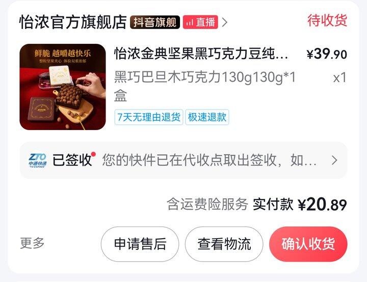 圣农还行吧,到手9块钱,没吃出奶香味,黑胡椒味的鸡块。蛋黄酥13块,奶香浓郁,比轩妈好吃。巧克力一般般,类似脆香米,比脆香米贵,看着像粪球。唇膜返19块金币,试一下。吾岛酸奶当天有红包,算上返的金币,基本不要钱。