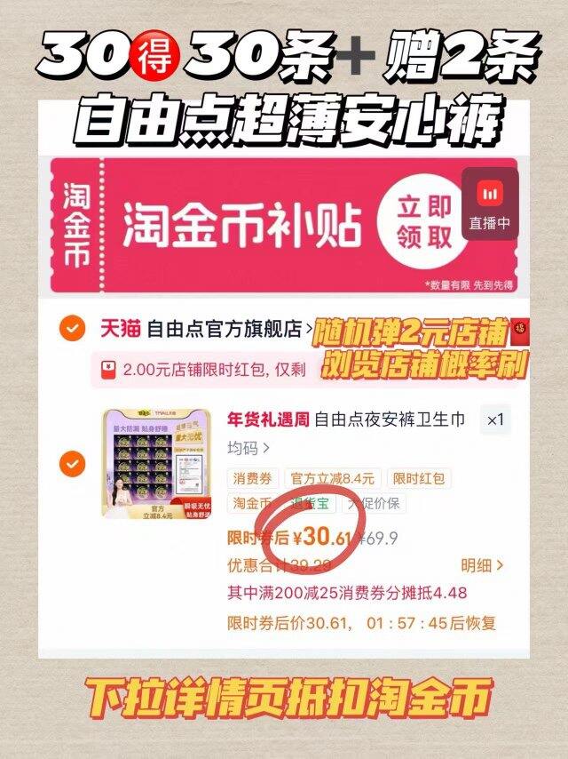 9毛/条‼自由点超薄安睡裤30🉐30条+贈2条!划下来比卫生巾还便宜了!晚上睡觉怎么翻滚都不怕侧漏!!安全感满满!!!