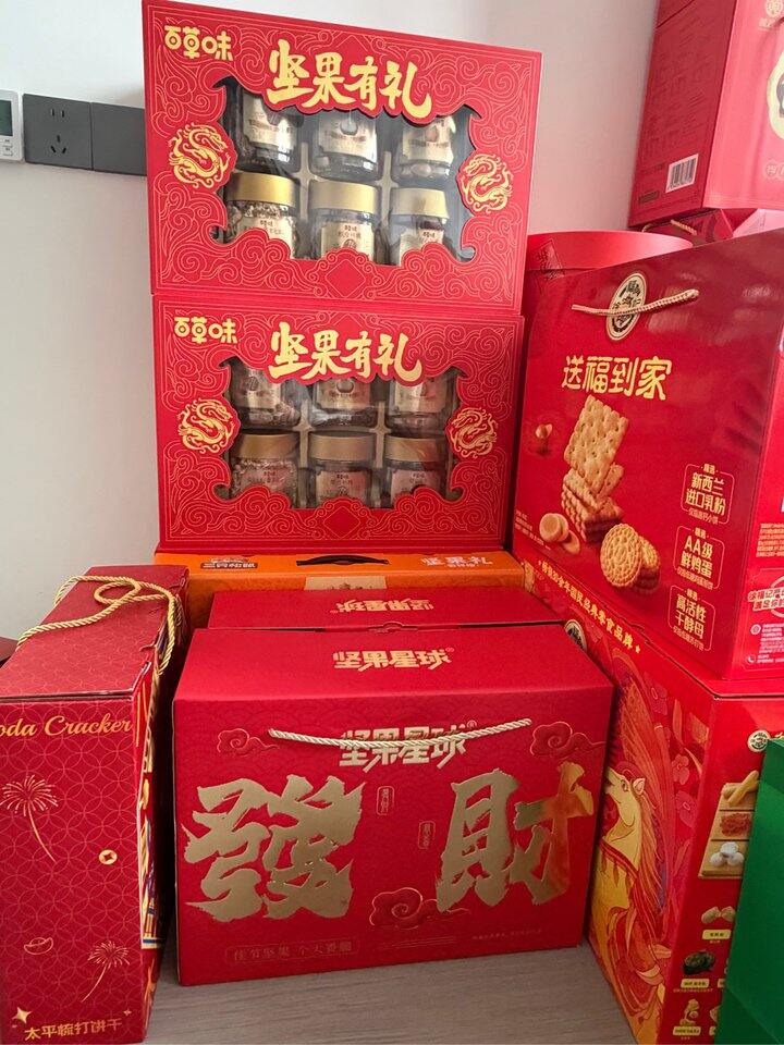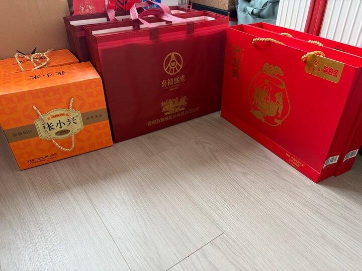 这里几份是送给双方的父母的,爸爸都是一箱五粮液的酒,妈妈是阿胶糕和锅巴,晚点准备再给两边买一把鬃毛梳,再配上水果也可以了。
