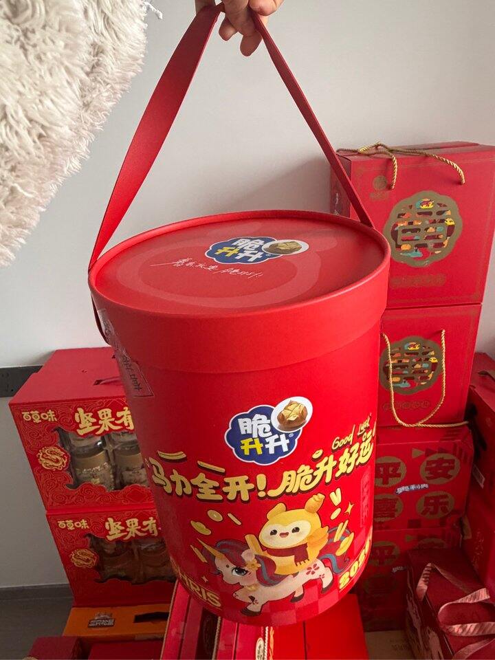 脆升升这个圆筒礼盒挺推荐的,真的老大一个,而且还挺沉,里面有配毛毯,送礼挺合适的