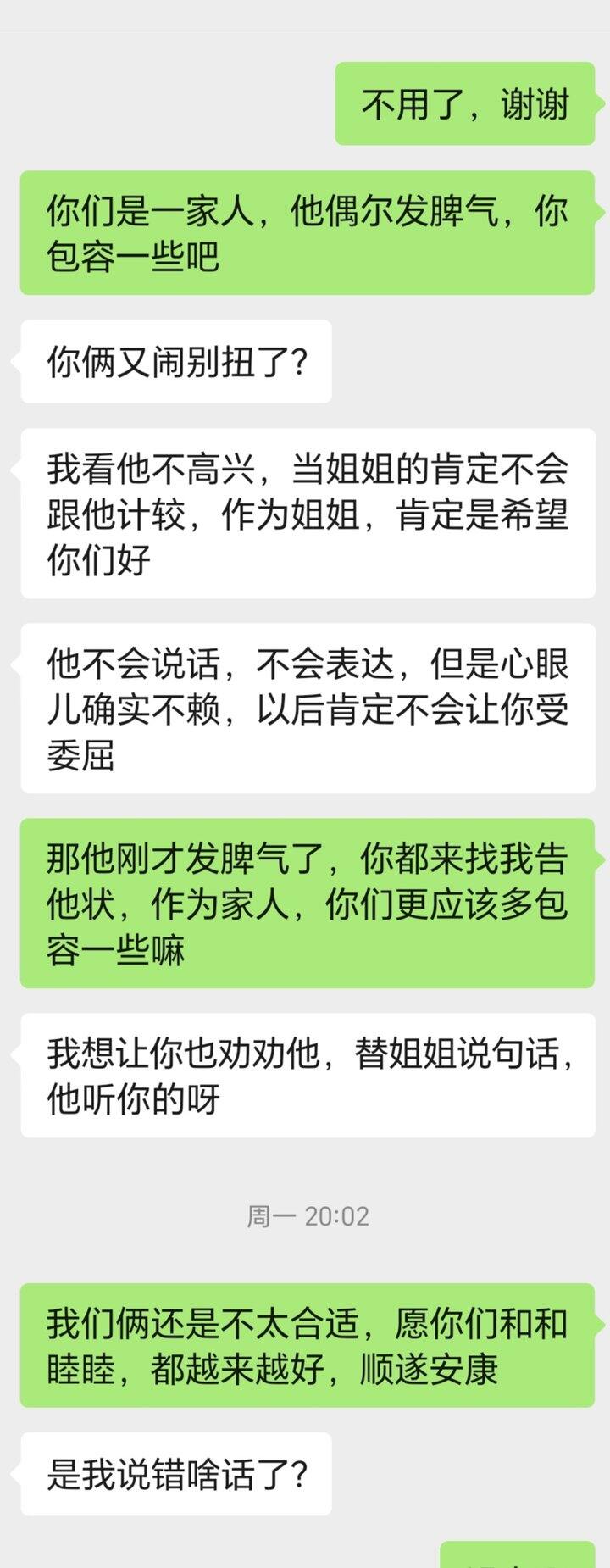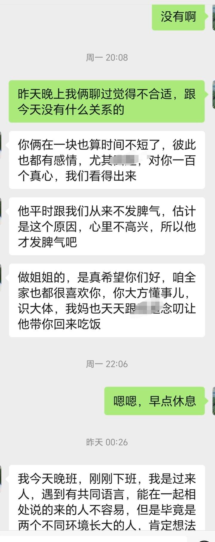 第二天他大姐还不知道我们俩分手的事,就这么巧他大姐来找我聊天,这是加上微信几个月后第一次聊天(这个聊天我当时更气更无语了,为了给彼此体面,我尽量控制自己情绪。其实我更想回复她,我去家里吃饭的时候以为都会在呢,想着大家一起吃饭呢,怎么你们都没去呢,是什么情况?)