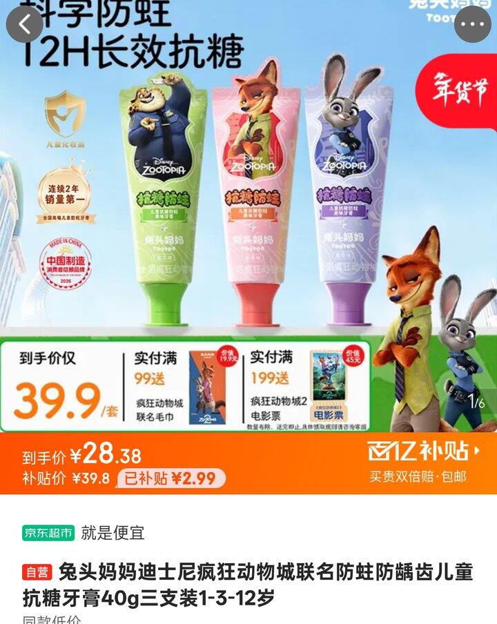【自营】兔头妈妈防蛀防龋牙膏40g*3支(疯狂动物城联名)