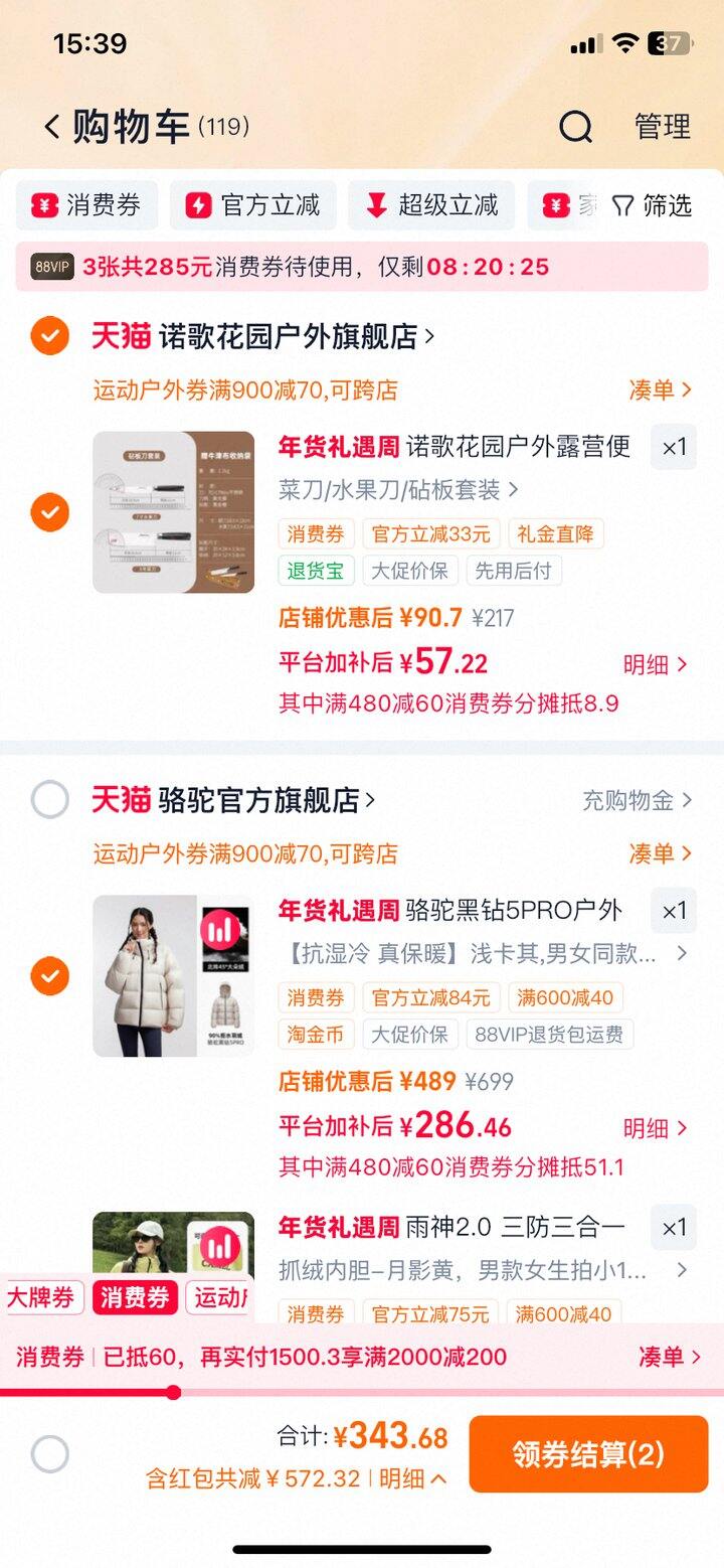 叠加900-70运动券、480-60消费券,骆驼黑钻5PLUS户外羽绒服到手299.7;