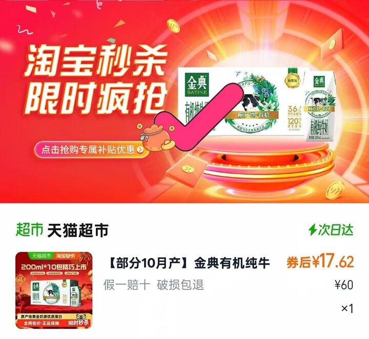 金典有机纯牛奶200ml10盒部分地区下拉💰1.7/盒https://m.tb.cn/h.7GCkO4g