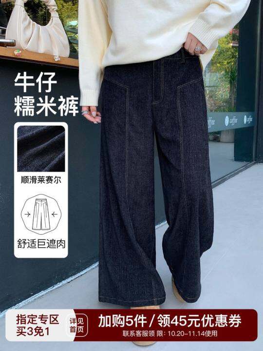 YUZI鱼子牛仔糯米裤特大码阔腿莱赛尔顺滑宽松遮肉后松紧腰四季款