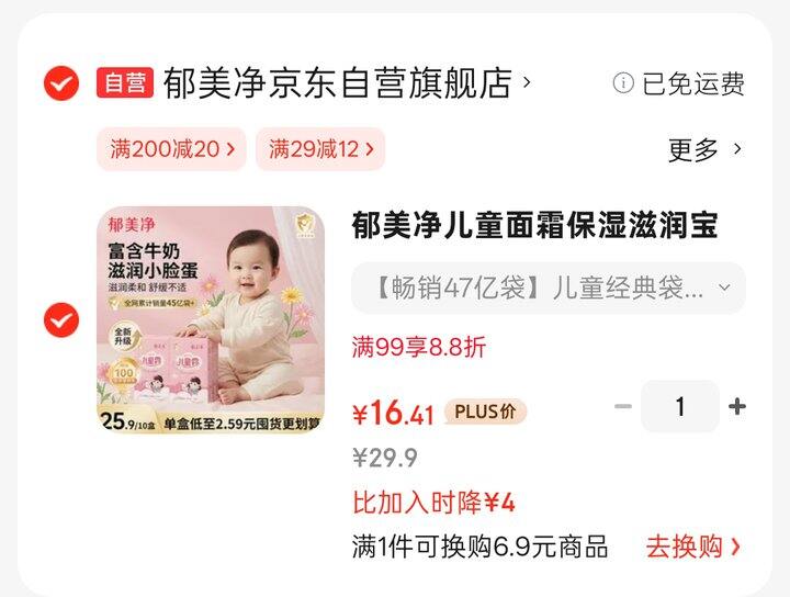 自营 郁美净儿童面霜 鲜奶霜25g*10盒