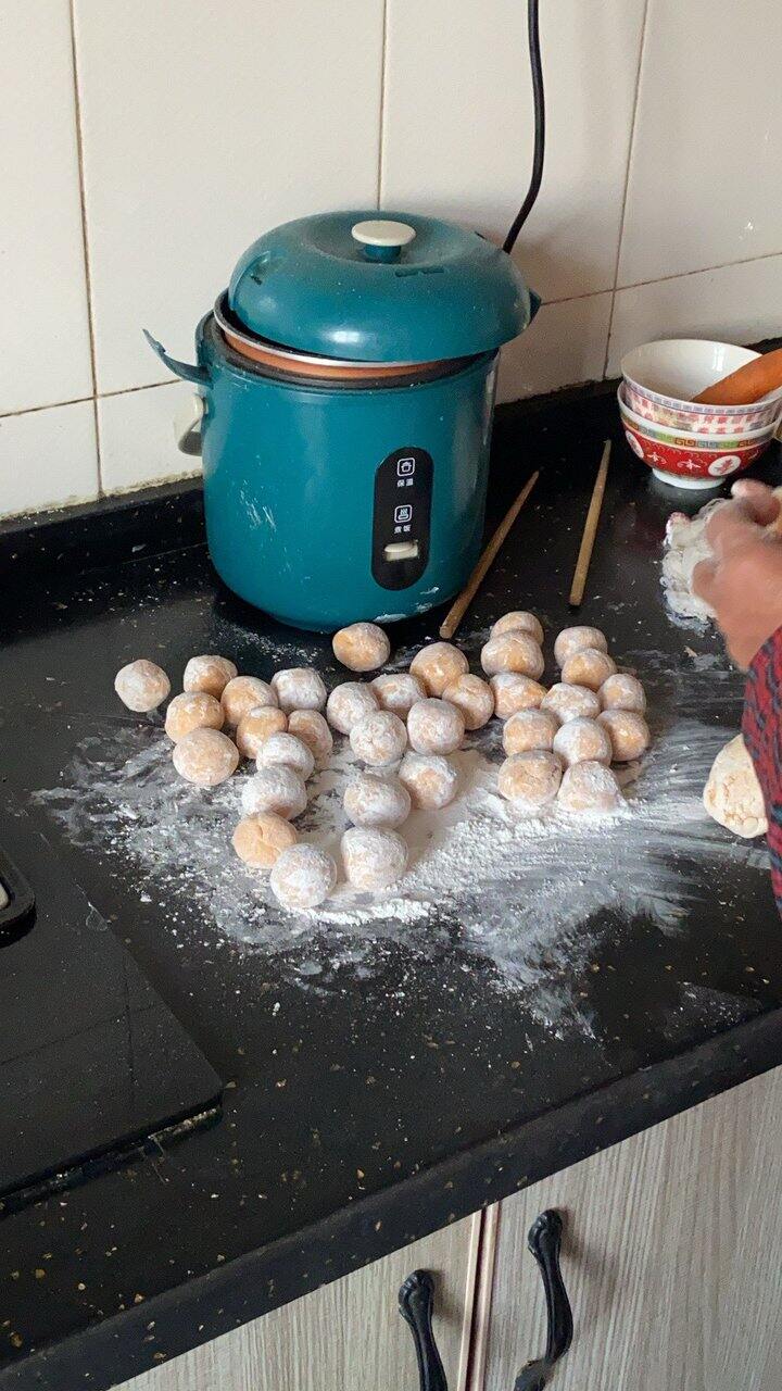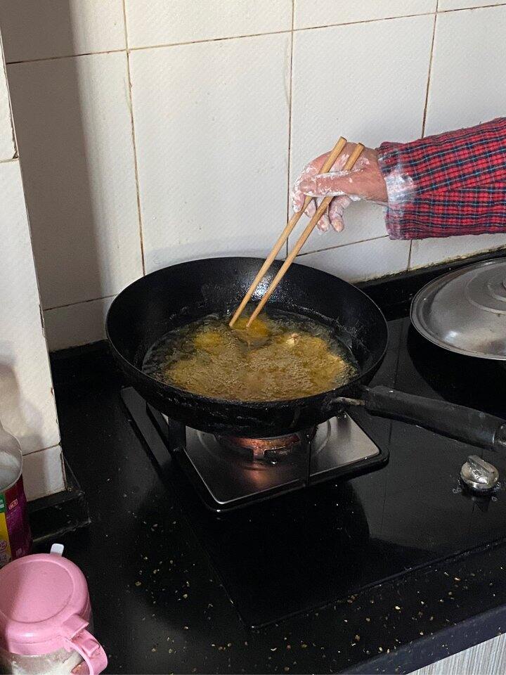 我给奶奶整了花,家里没有花瓶,就养在桶里,奶奶给我炸了芋头圆子,临走还让我带点给她女儿。