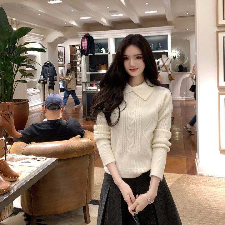 famouswang冬新款百搭乖乖老钱Polo领麻花菱格针织毛衣长袖打底衫