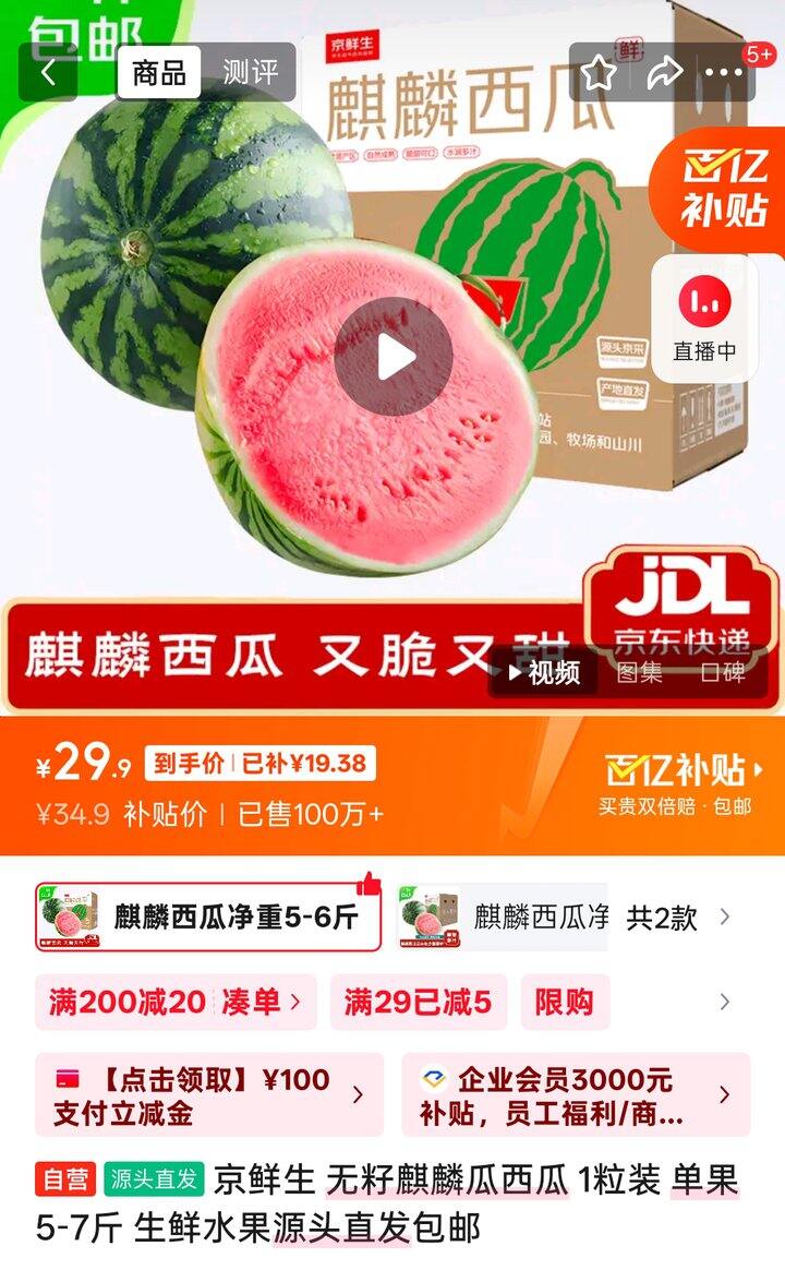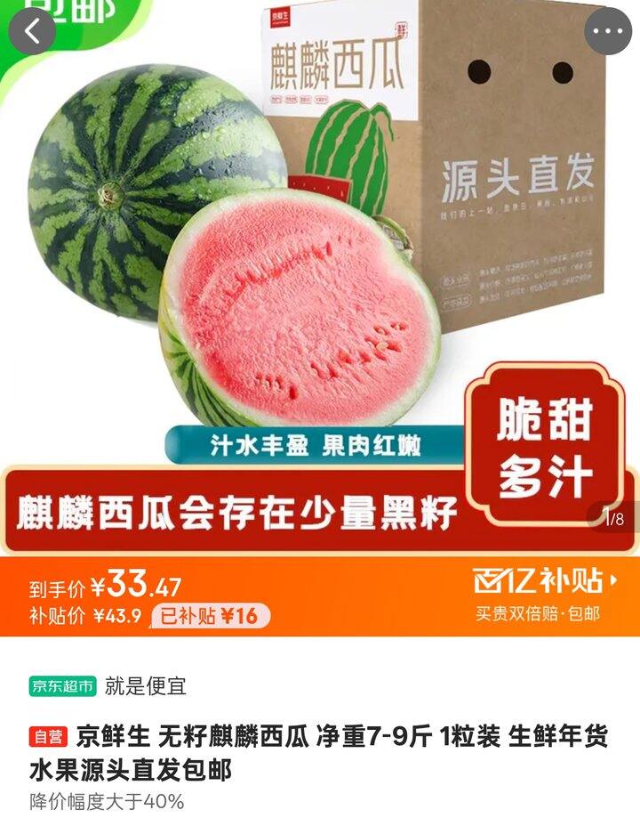 【自营】京鲜生 无籽麒麟西瓜