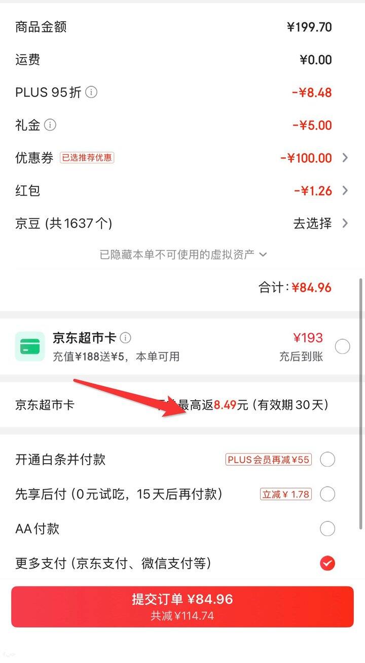 Plus到手86.22,返8.49卡(如图3)=77.73,