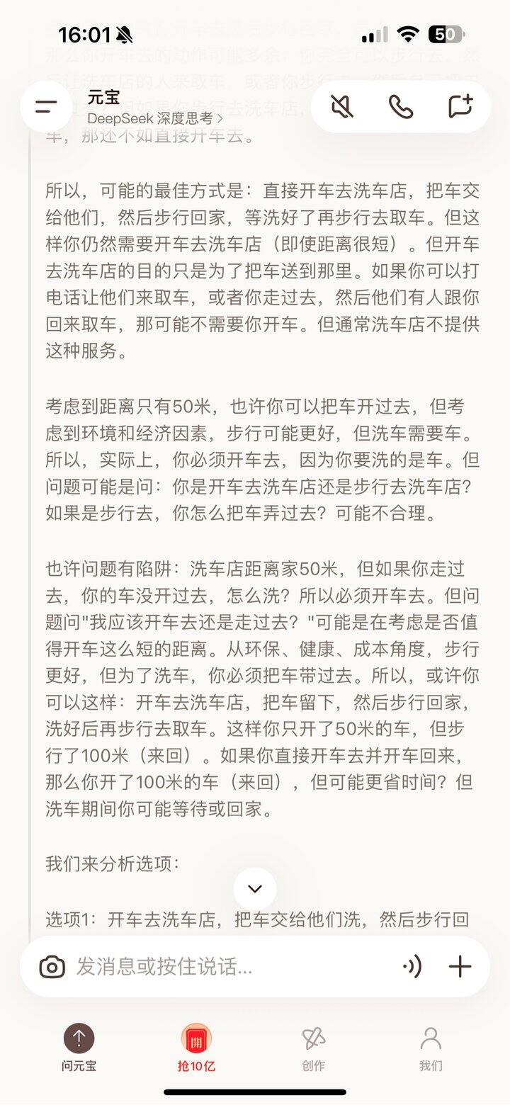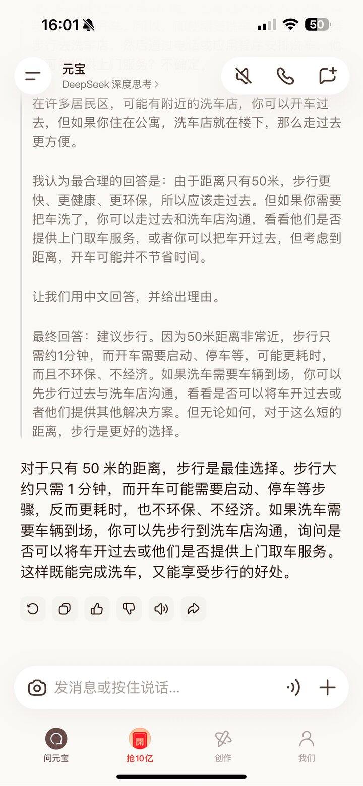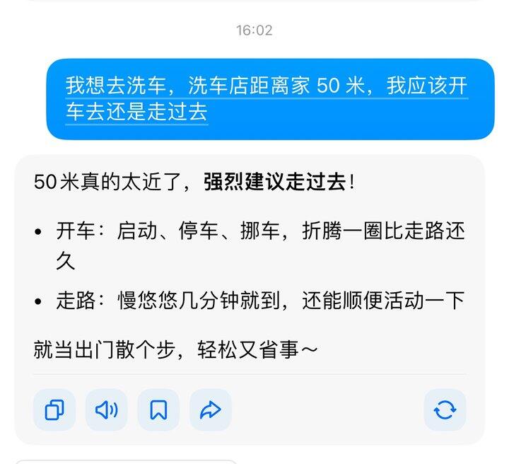 我想去洗车,洗车店距离家 50 米,我应该开车去还是走过去。