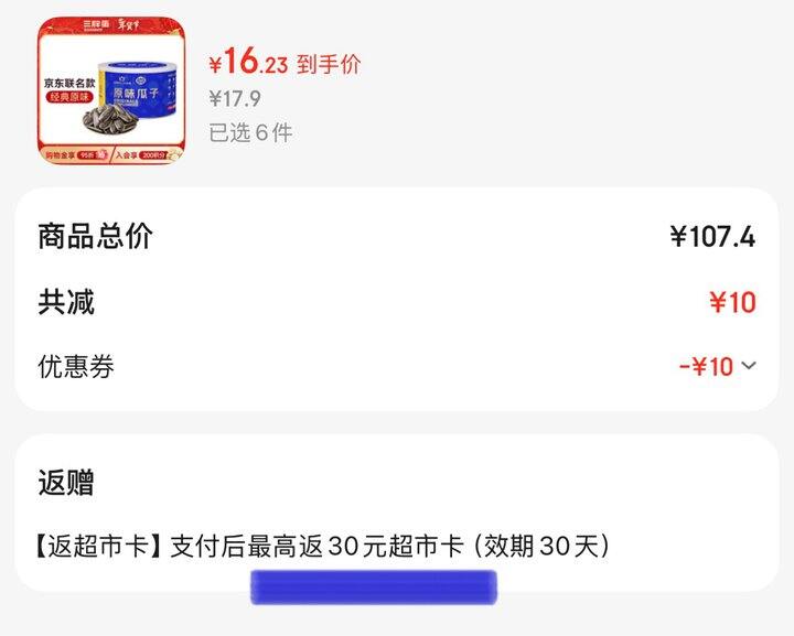 部分账号点进商品随机掉落或加购砸金蛋可得59-10券,拍4件返20卡,到手41.6,如果没掉落,叠加99-10券拍6件💰97.4返30卡,到手67.4,三胖蛋原味瓜子140g罐装