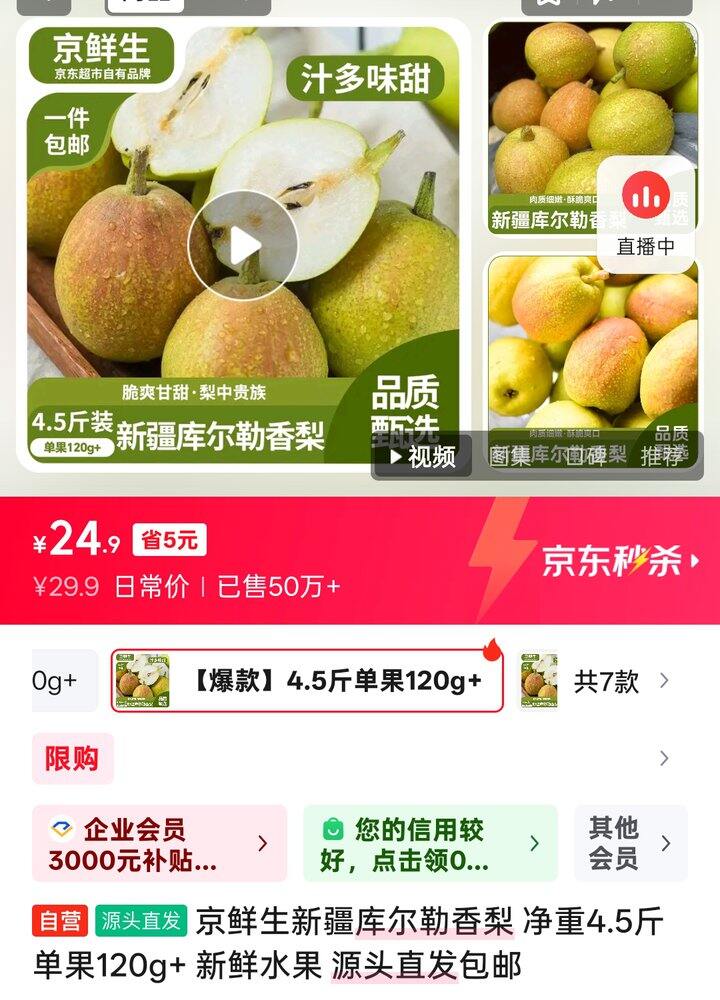 京鲜生 新疆库尔勒香梨 净重4.5斤