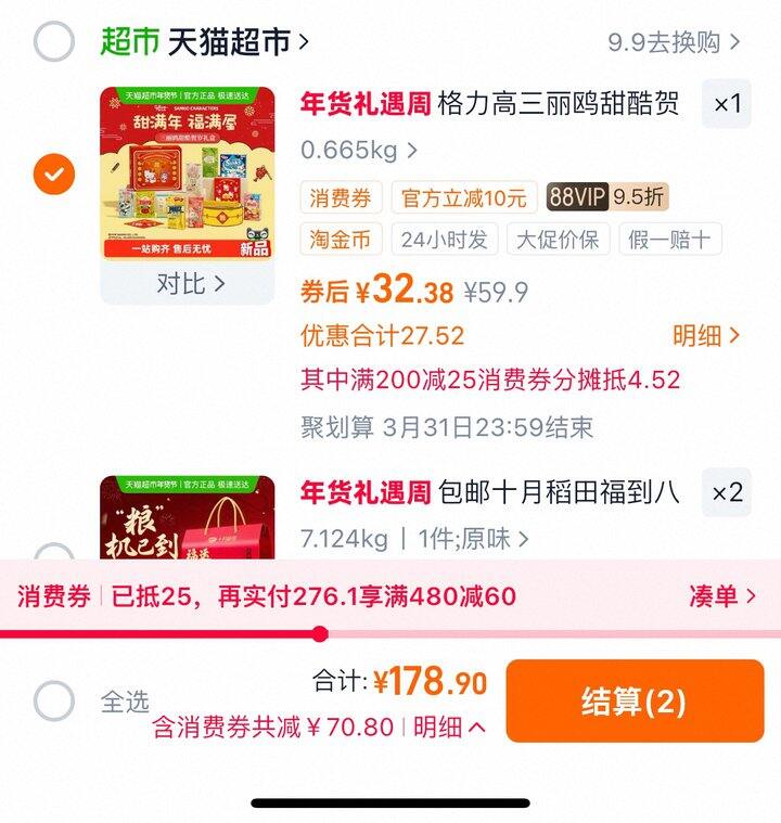 用200-25消费券,用完了就购物车凑其他的消费券哈