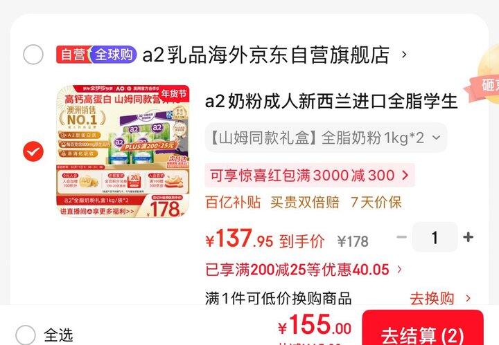 a2奶粉成人新西兰进口全脂学生奶粉高钙山姆同款礼盒新年送礼1kg*2