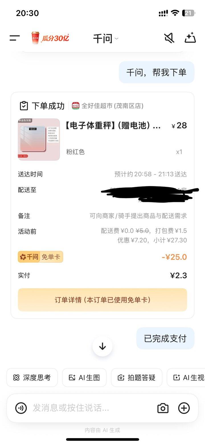 首先在应用商城那里下载一个叫千问的App,然后打开千问App,左上角有两个横杠点开之后,右下角有一个扫二维码的标志,再扫图二的二维码,就可以领到一张25元的免单券,¥25内的东西都可以免单。只要超市里有的东西都可以买。