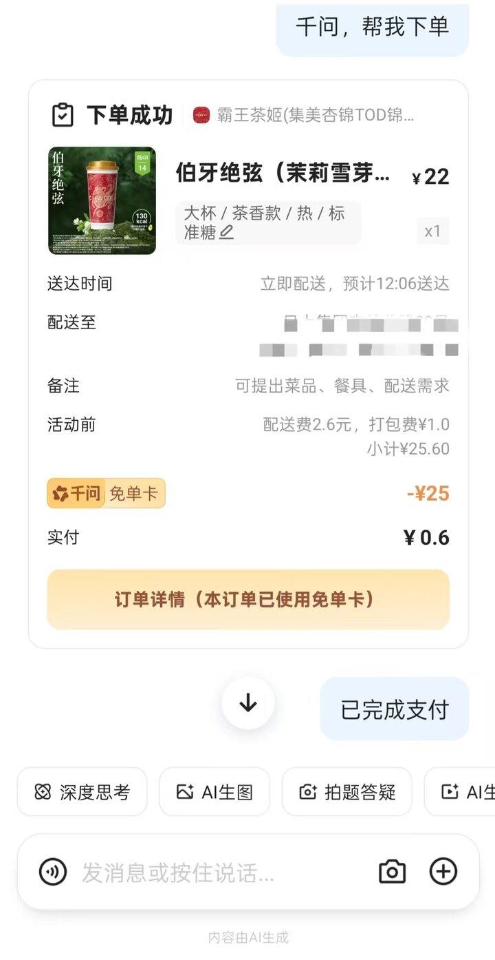 3️⃣发送 千问,帮我点杯奶茶/买车票/电影票/门票都🉑