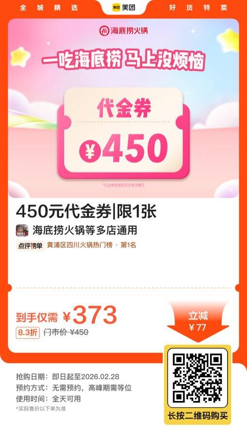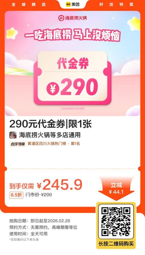 🍲海底捞火锅|100元代金券|限10张|多店可用|节假日通用 (最多叠加使用10张,全场通用)89.9