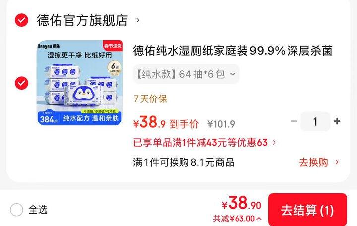 德佑纯水湿厕纸64抽*6包