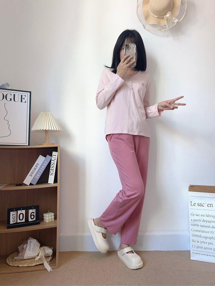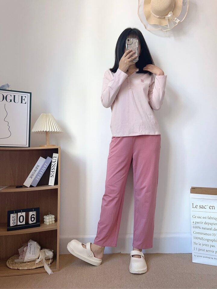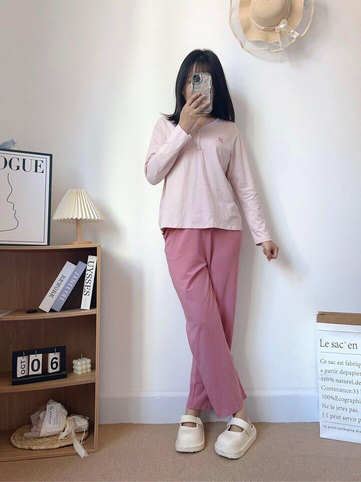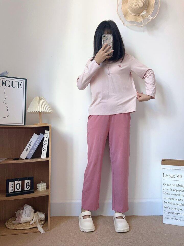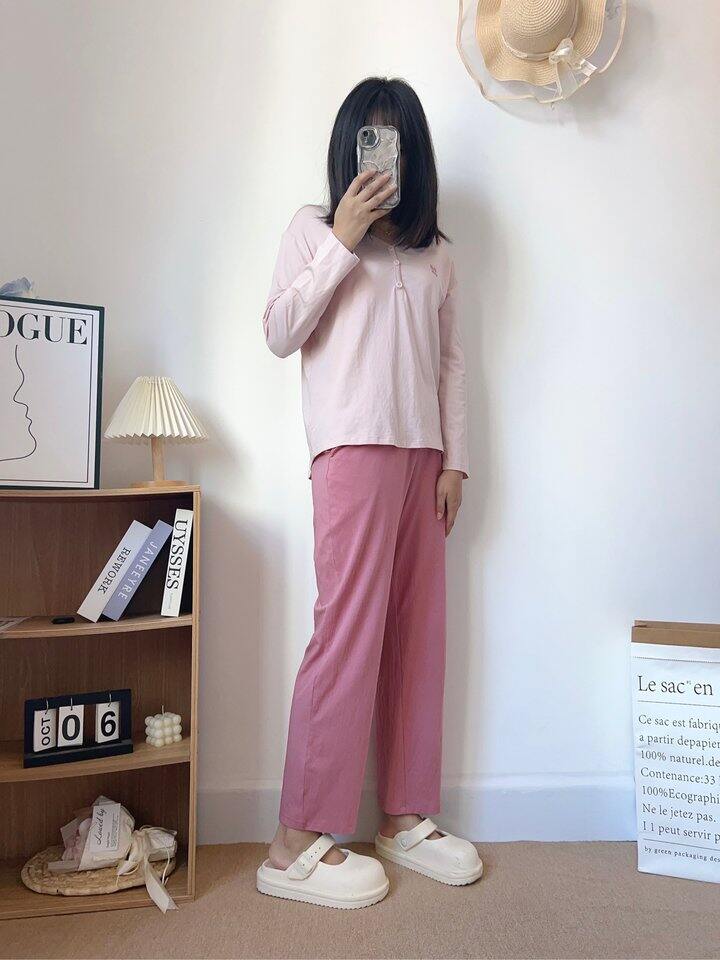 睡衣面料薄而不透,樱花粉自带柔光滤镜,自拍根本不用开美颜。弹力腰头松紧适中,吃饱饭后小腹毫无压迫感,侧躺睡觉时裤腰也不往下掉~最绝的是吸湿速干!我晚上容易盗汗,但穿它后枕巾都是干爽的。关键细节满分:缝线全部内包边,腋下无摩擦疙瘩,标签是水洗标印刷,完全不硌脖子!颜色温柔绝绝子,一套搭配起来非常的好看,居家必备好物