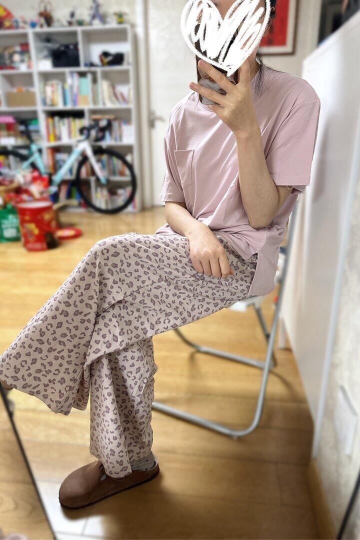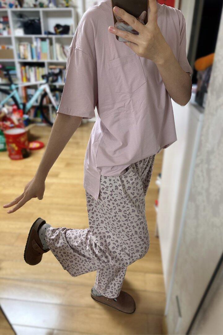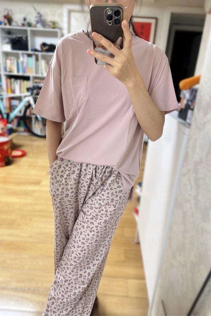 橡皮粉色短袖上衣+粉灰色豹纹长裤,不会显单调,棉和粘胶的复合面料亲肤垂顺,衣服带微弹效果,上衣裤子都带口袋,丢个垃圾可以随时出门,163选的165的码子正合适,非常喜欢。感谢福利