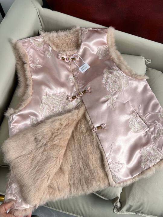 实拍樱花粉秋冬新款高级醋酸刺绣兔毛真毛皮草百搭保暖两面穿马甲