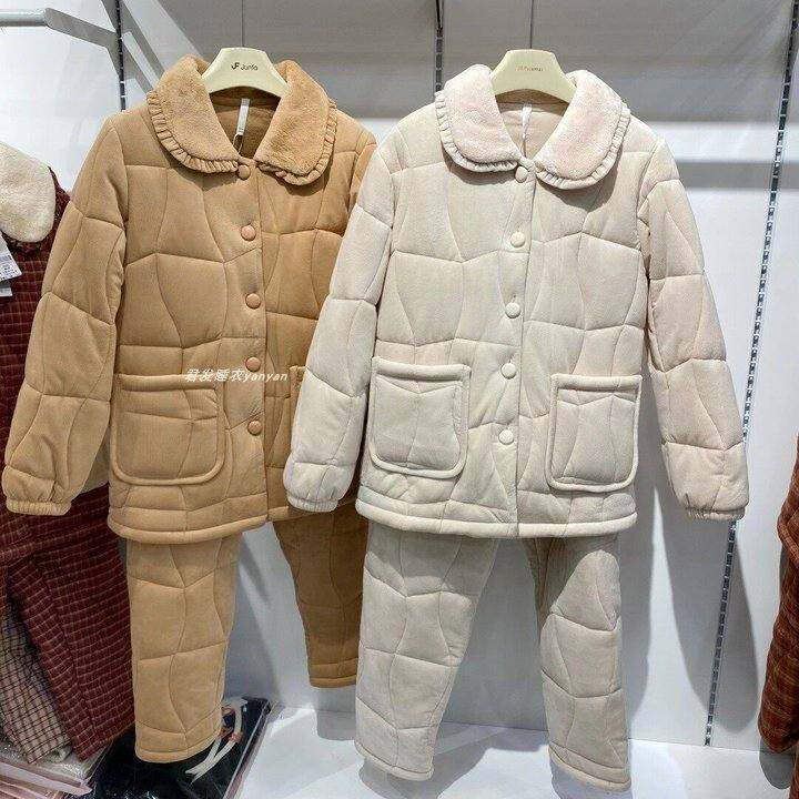 2025宅家冬季加厚睡衣女士长袖三层夹棉加绒青果绒舒适家居服套装