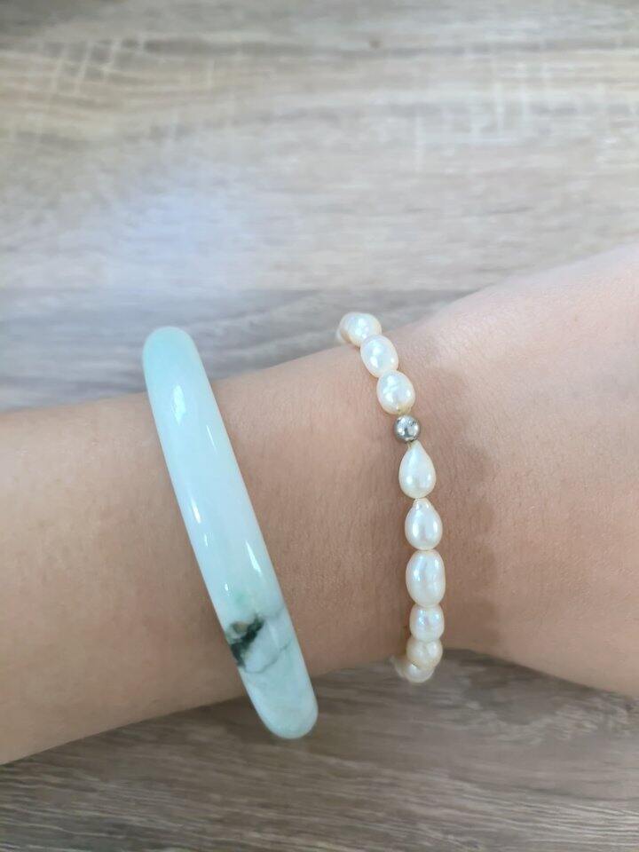 昨天逛名创看到一条珍珠手链,很衬我的镯子,19.9,价格也很便宜,但是我想自己买珠子回来串,家里应该有类似颜色的玉珠子,那只需要买珍珠回来串就行了。