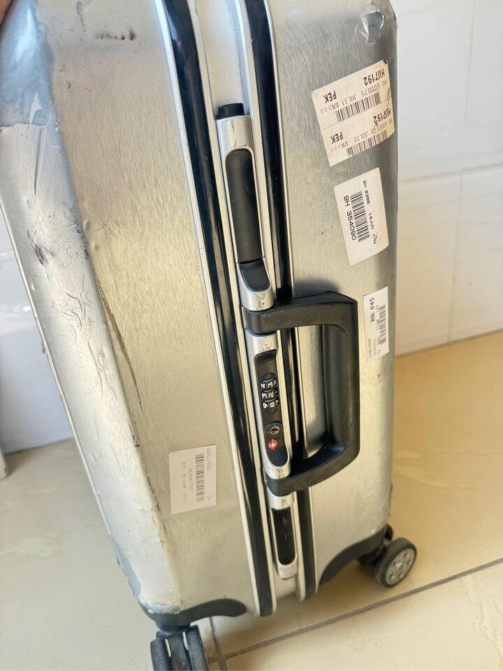 这个箱子我用快 10 年了,箱体被我造得就是战损版哈哈,但是轮子都好好的,然后到今年拉杆的把手按压弹簧老化了,本来想要换配件就好了,结果发现下面的居然被我磨破了哈哈哈哈。