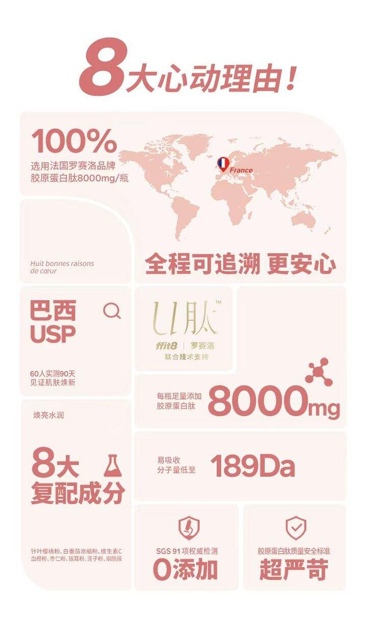 ✅全程可溯源,法国临床验证!⭕️每瓶狂加 8000mg 胶原肽是普通胶原蛋白肽产品的2-3倍❗⭕️189Da 小分子不用被消化,直接被小肠吸收❗