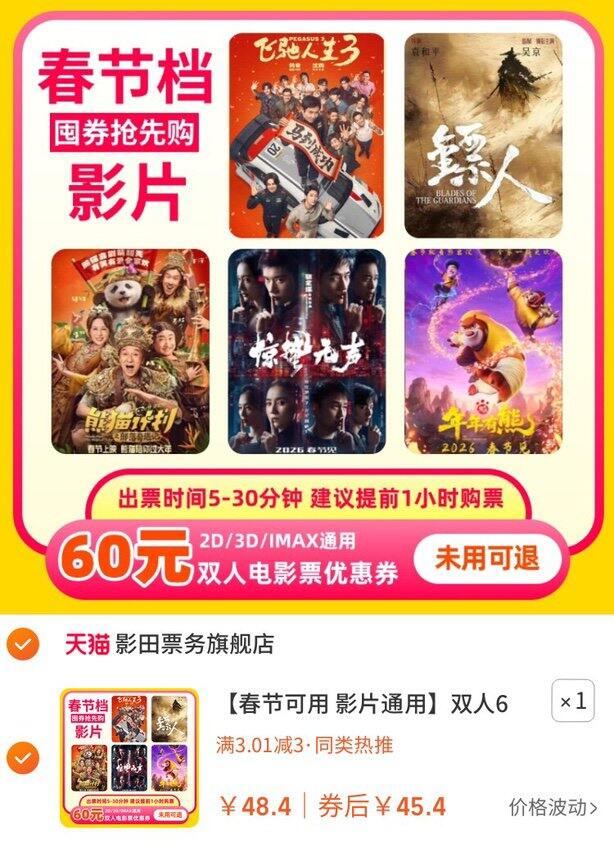 双人60元电影优惠券💰45.4,