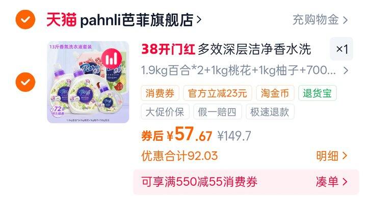 叠金币拍!到手3桶多的量,芭菲香氛洗衣液深层洁净
